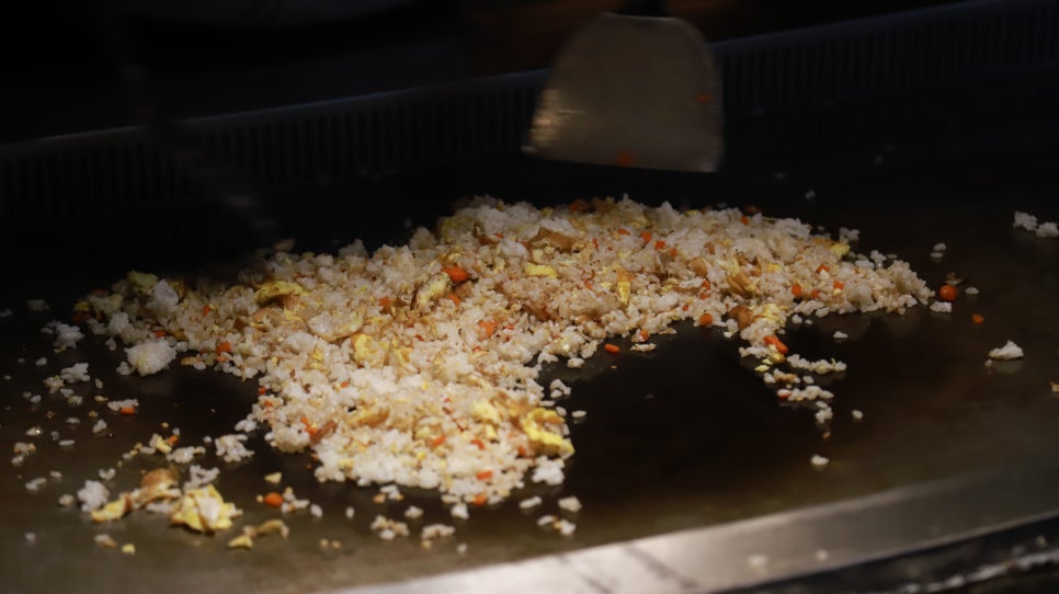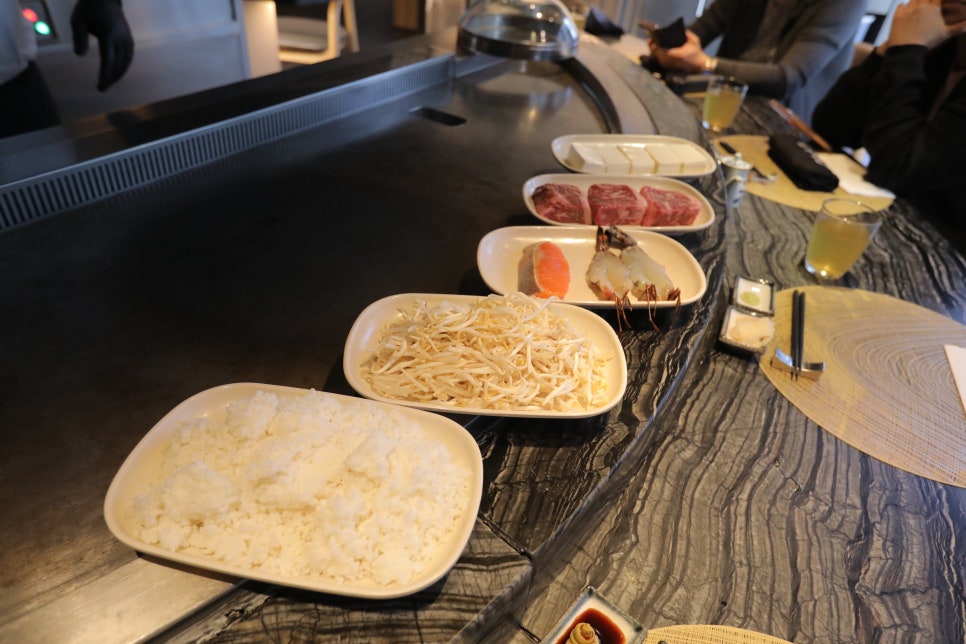 철판 앞에 앉아 요리사가 직접 음식을 만들어내는