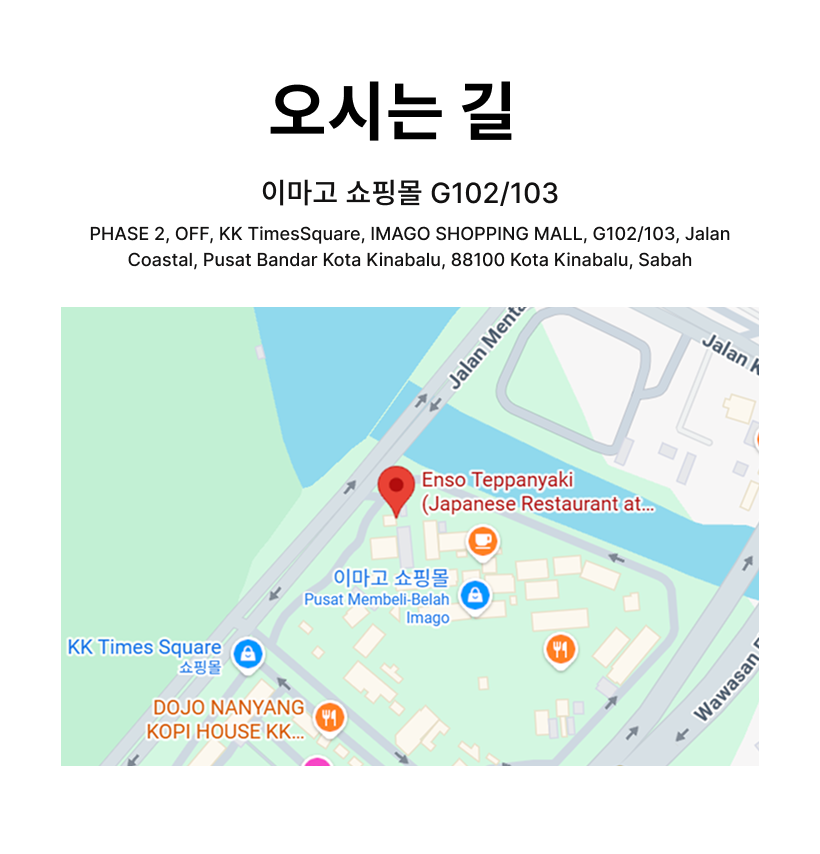 주    소 : PHASE 2, OFF, KK Times Square, IMAGO SHOPPING MALL, G102/103, Jalan Coastal, Pusat Bandar Kota Kinabalu, 88100 Kota Kinabalu, Sabah, 말레이시아