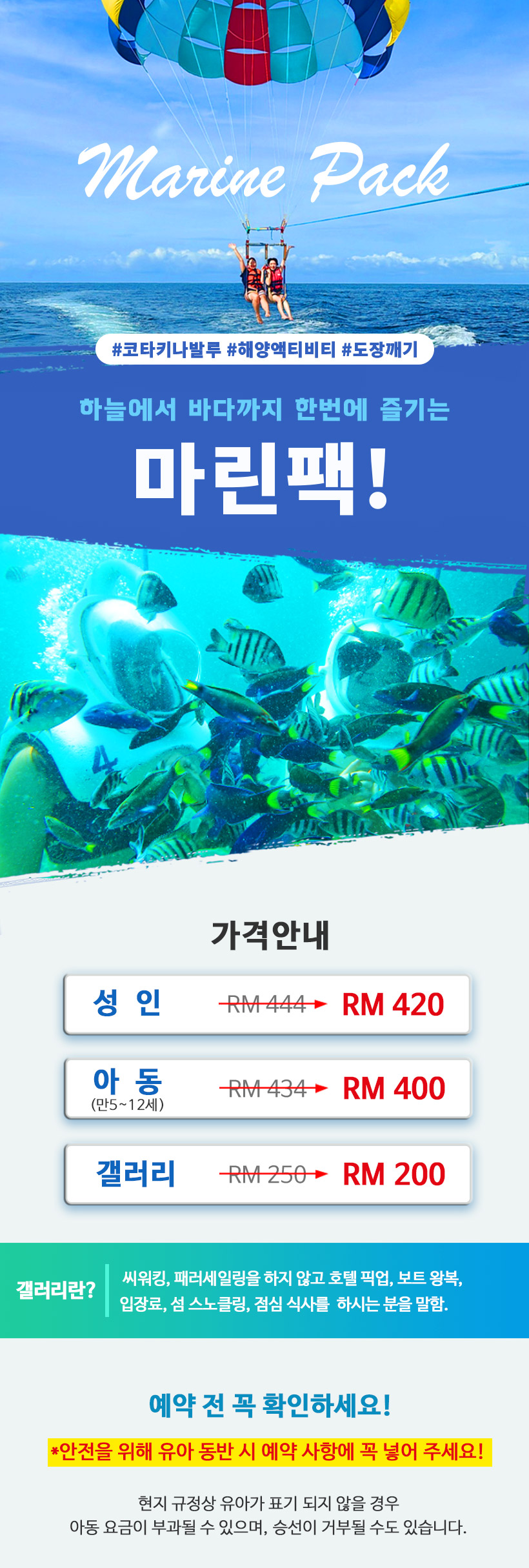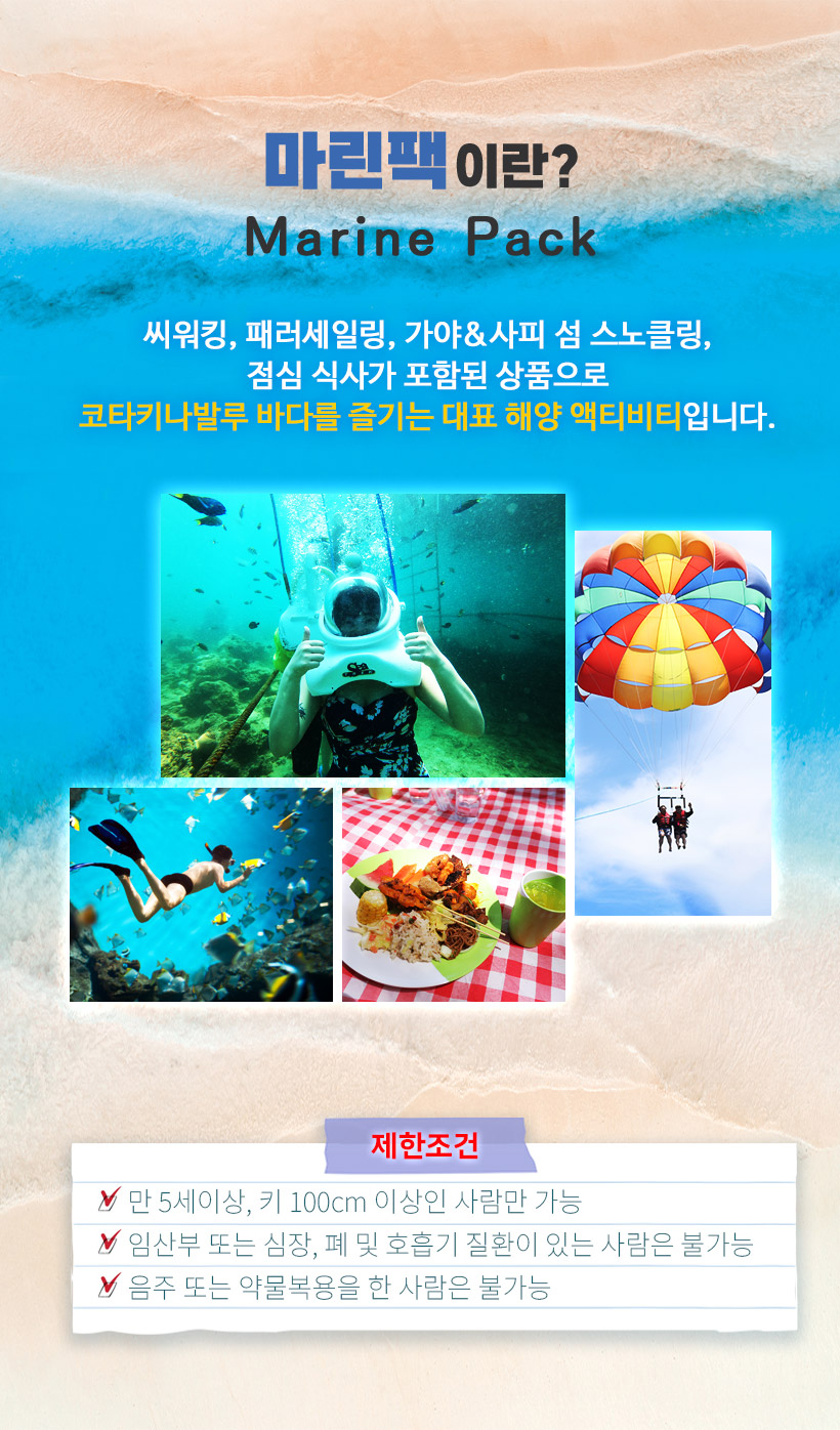 - 해양 액티비티는 안전문제로 가급적 사피섬에서만 즐기시길 추천합니다.