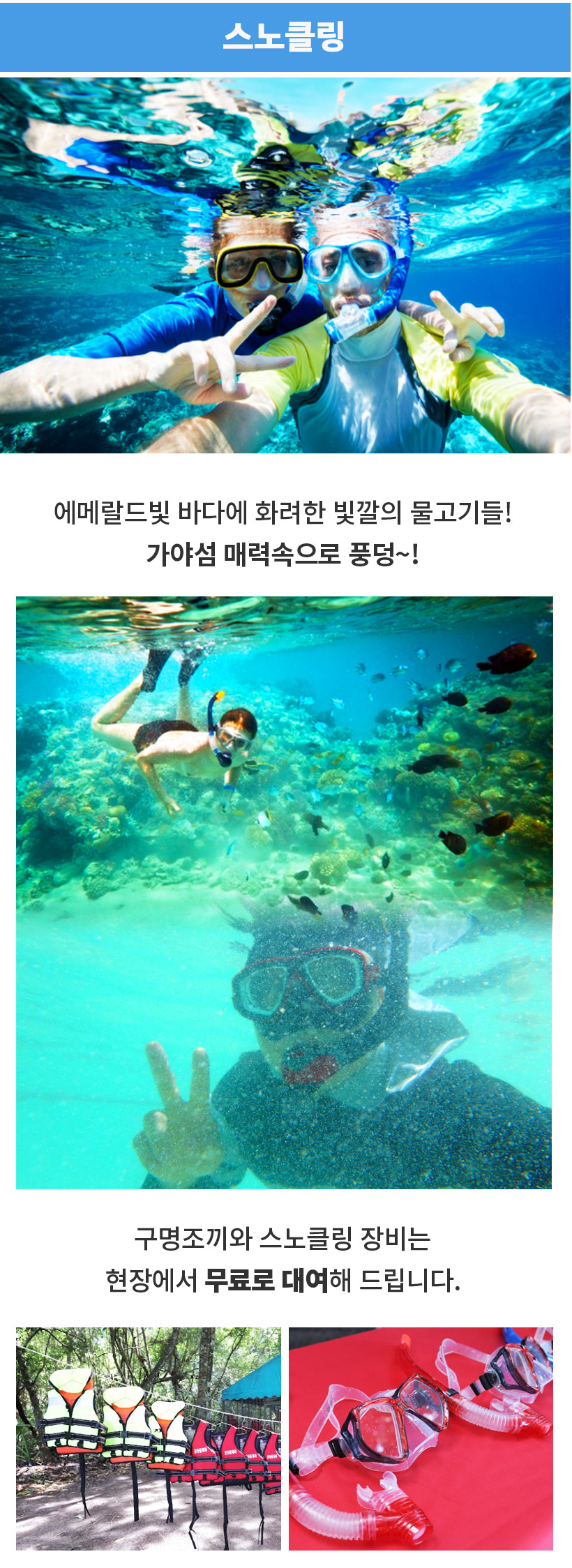 - 스노클링 체험시 날카로운 산호에 다치지 않도록 개인안전에 주의바랍니다.