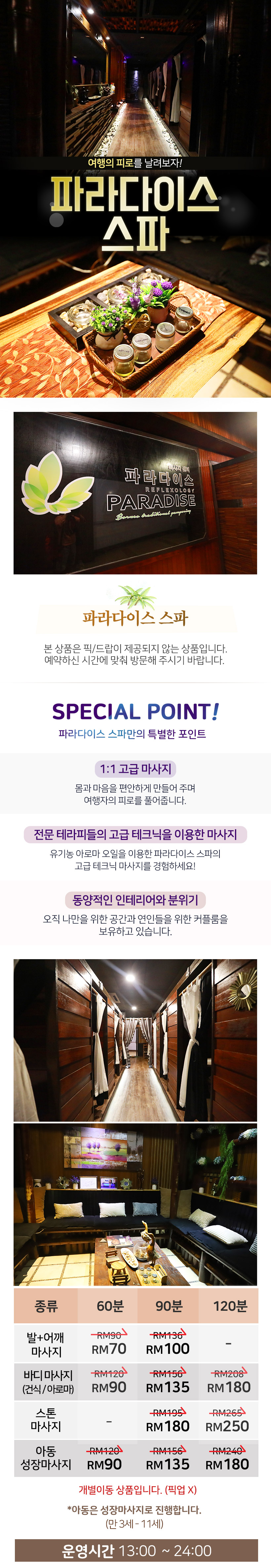 - 2인 이상, 1시간 30분 이상 코스를 이용하시는 분들께는 마사지 종료 후 호텔 또는 공항까지 샌딩 서비스가 제공됩니다.