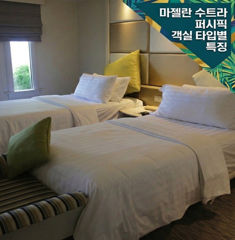 최고급 객실인 마젤란 클럽은 오션뷰로 구성된 특별한 공간이에요. 킹베드 1개 또는 싱글베드 2개 중 선택할 수 있어서 다양한 여행 스타일에 맞춰 이용 가능해요.