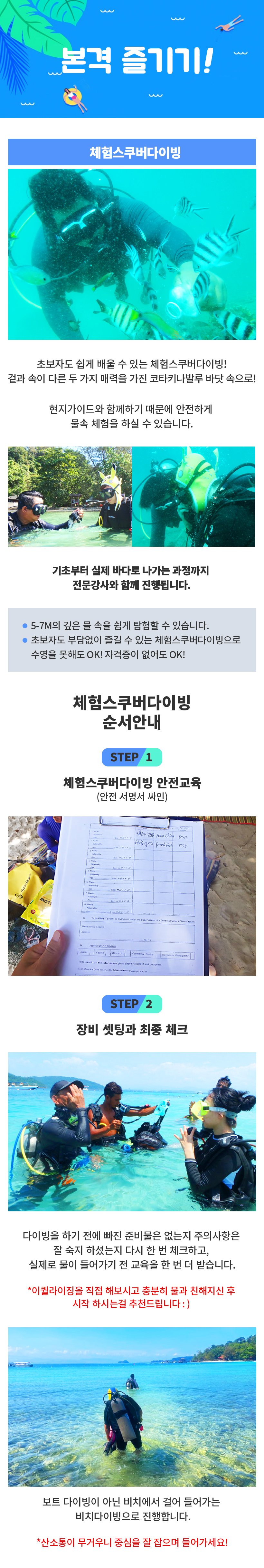 - 스노클링 체험시 날카로운 산호에 다치지 않도록 개인안전에 주의바랍니다.