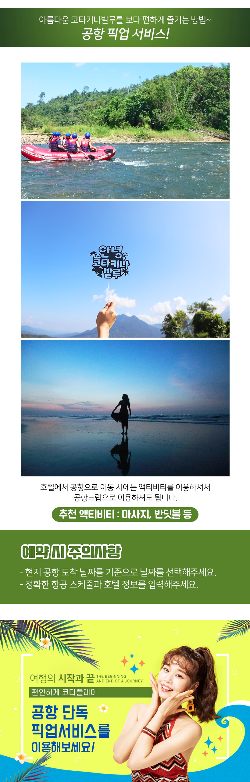 - 고객 부주의 등으로 발생한 부상 및 사고에 대해서는 본인이 책임져야 하며, 예약 대행사인 코타플레이와 현지업체(이하 면책자들)에게 책임을 전가할 수 없습니다.