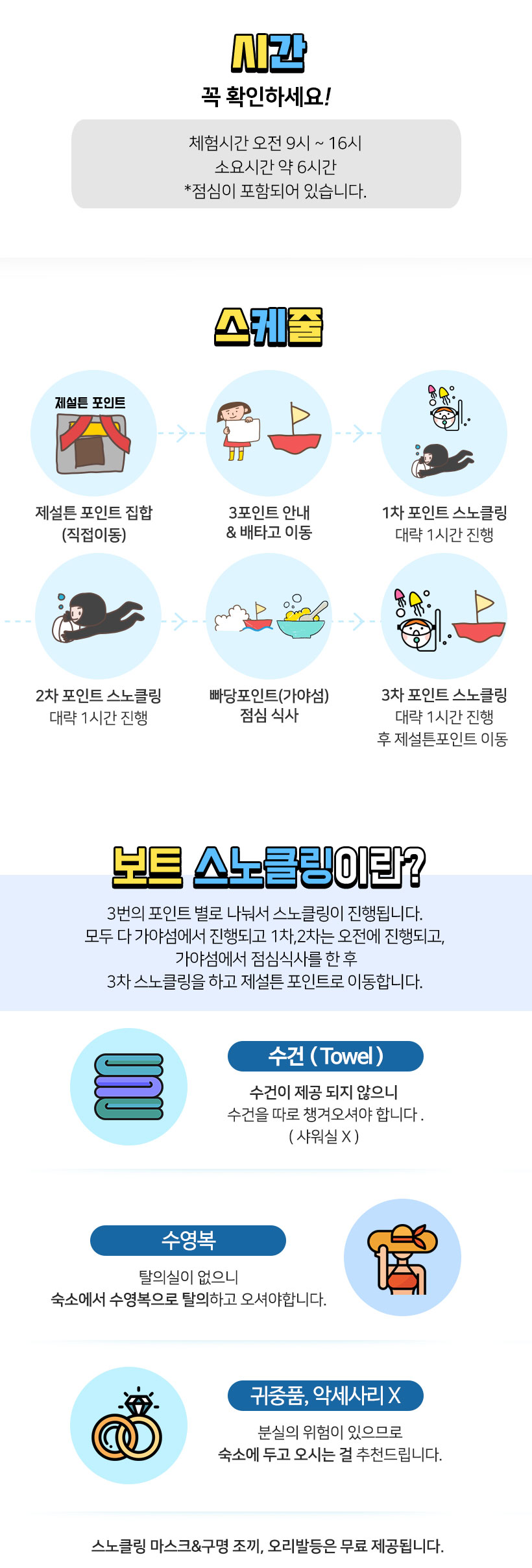 - 선착장 이용료, 스노클링 마스크 , 구명조끼, 오리발등 (아동용 제공X)