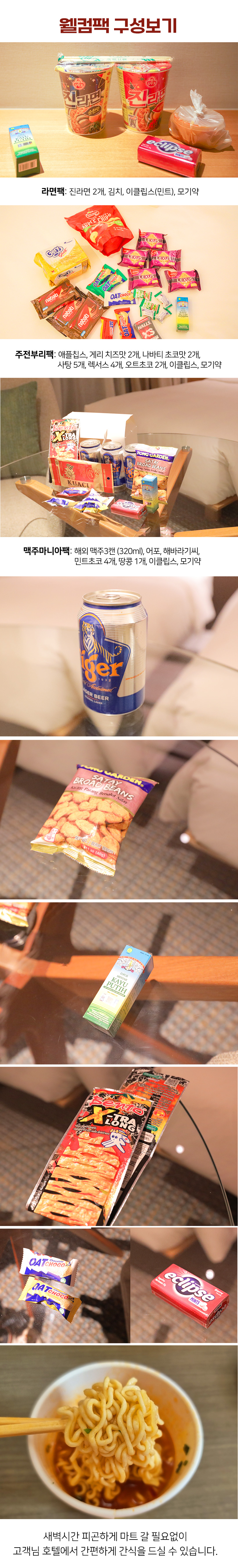 웰컴팩은 알찬 스낵과 음료가 들어있어 밤에 야식으로 간단하게 드시기 딱이죠~